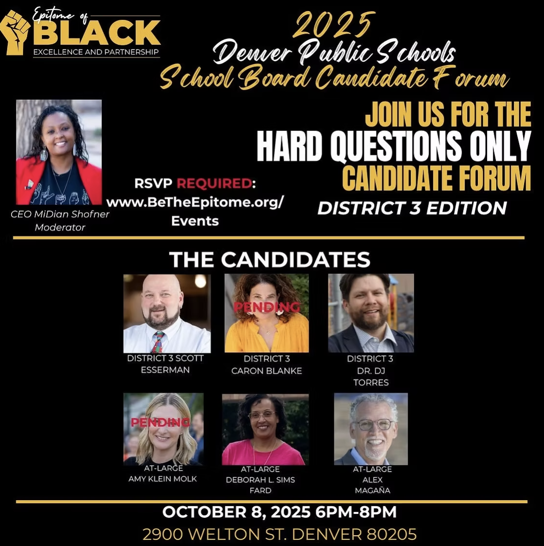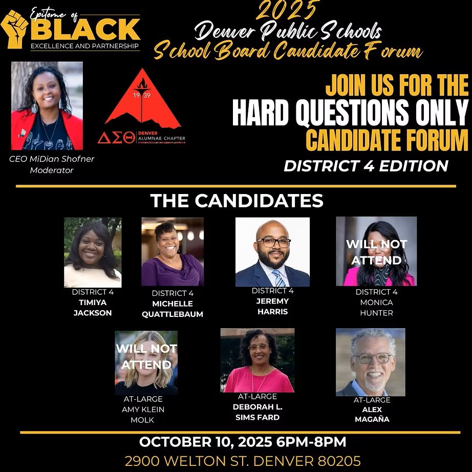 Denver, 2900 Welton St, Denver, CO 80205, USAEpitome of Black Excellence and Partnership will be hosting “Hard Questions Only” School Board Candidate Forum District 4 Edition, Friday, October 10, 2025 from 6 p.m. – 8 p.m. Click here for more information and registration. -