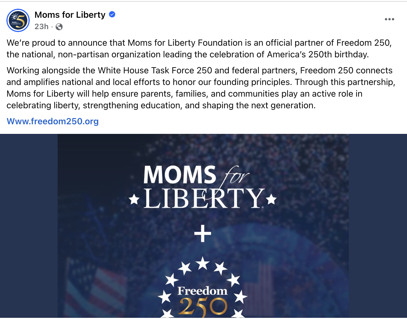 Secretary McMahon has been touring states to promote the History Rocks! Tour & the Freedom 250 Organization. Moms for Liberty has signed on as a partner to the Freedom 250 Organization https://coloradopubliceducationwatch.wordpress.com/2026/02/04/moms-for-liberty-announced-their-freedom-250-partnership-freedom-250-claims-to-be-a-nonpartisan-organization/